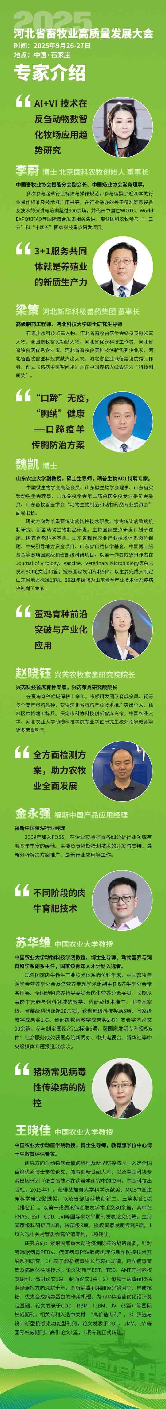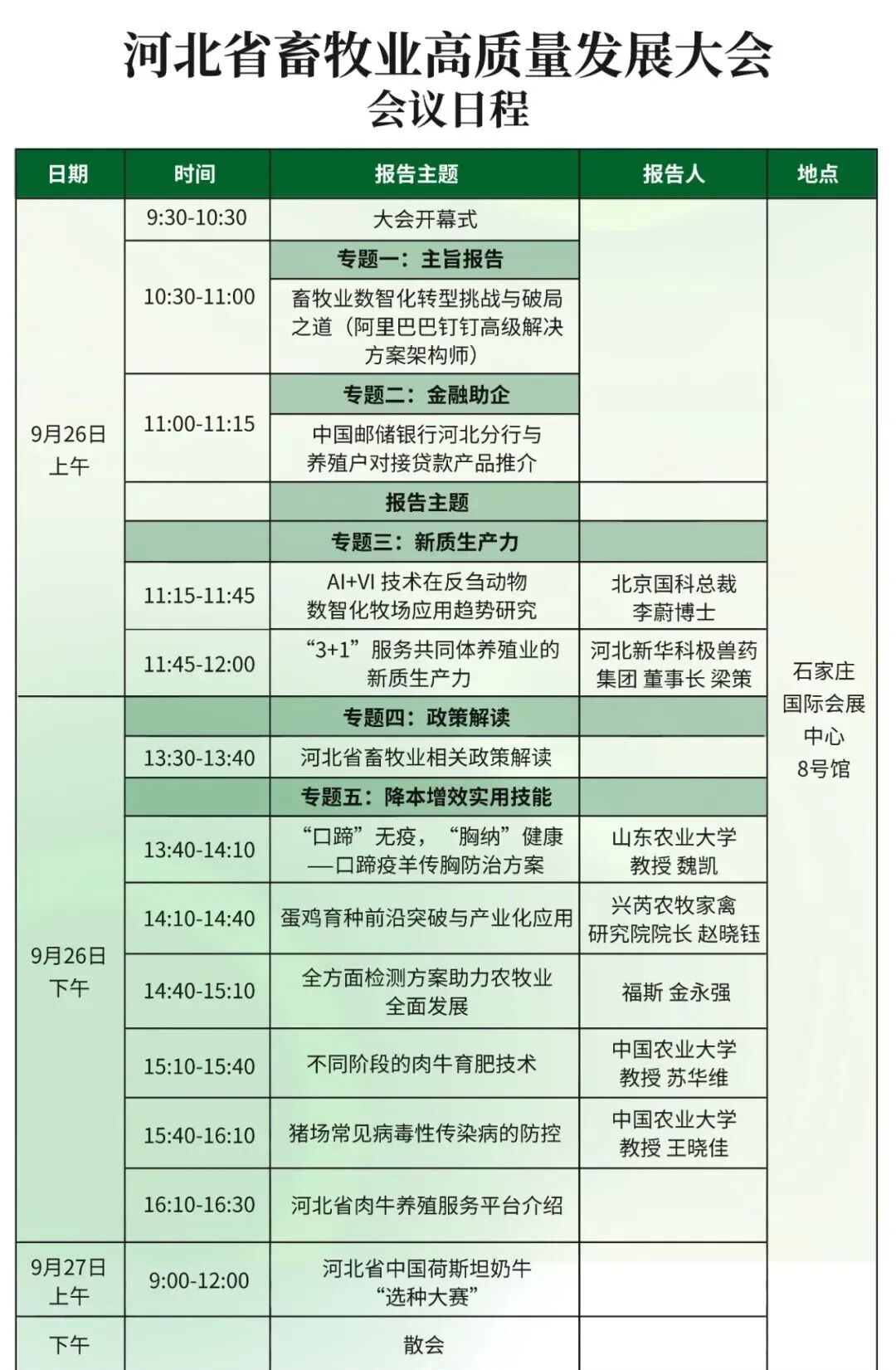 本次大会内容丰富,既有相关政策解读、人工智能畜牧产业前沿技术,又有针对目前现状节本增效技术措施,围绕养殖企业的金融对接等活动。北京峪口禽业总裁孙皓、禾丰副总裁穆绍博、君乐宝副总裁姜树旺、大北农集团副总裁、河北牧原区域经理、河北温氏总经理等出席大会。北京、天津、山西、内蒙、宁夏、广西等相关协会负责人将参加大会。还将邀请全国畜牧总站、国家畜牧业协会、省农业农村厅领导出席会议,参加大会的还有北京、天津、山西畜牧业协会领导、广西猪业协会、省内畜牧兽医学会、动保、饲料等协会领导,大型牧业集团负责人、种业集团负责人等。
