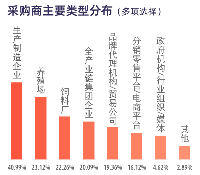 2025年海外采购意向明确买家超88.3%,其中40.99%观众来自生产制造企业,45.39%为养殖场或饲料厂,20.09%为全产业链集团企业,如Cobb Vantress AP、Charoen Pokphand Group、DSM、Adisseo、Cargill、Evonik、BASF、Zoetis、Orffa、Clariant、Trouw Nutrition、Japfa公司、HELM AG等知名国际企业直接参观采购,其中有部分企业已明确将组团来2026现场,这反映出VIV SELECT CHINA具有强大的国际吸引力和行业影响力。