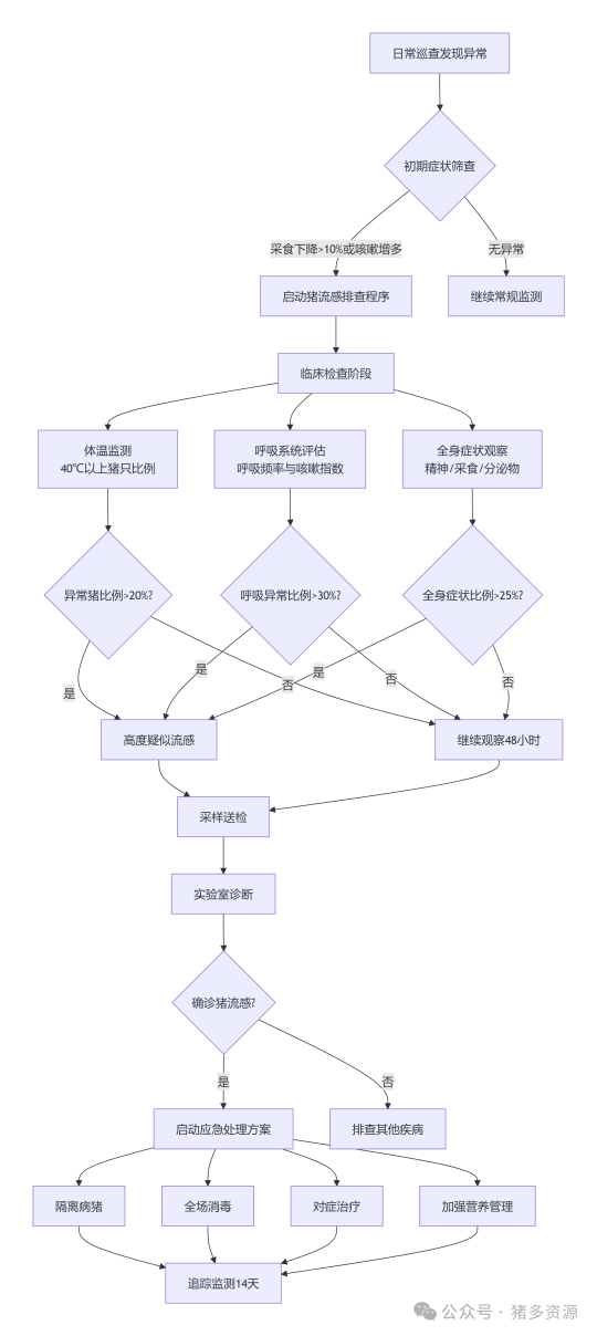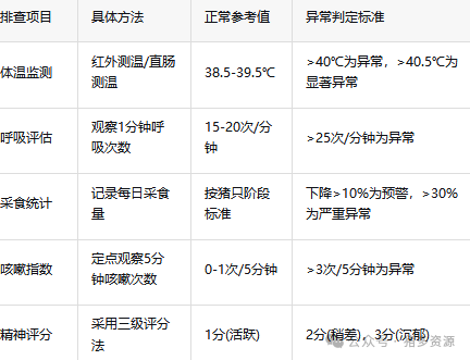 群体观察:重点检查整栋舍或整个群的发病比例。若在极短时间内有超过30%的猪表现相似症状,应高度怀疑猪流感。
