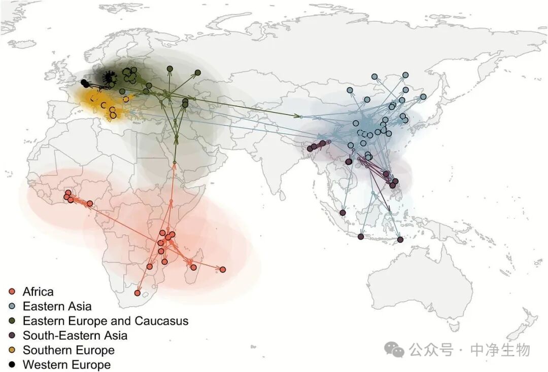 1.起源与扩散时间线:研究推断,引发当前欧亚大流行的病毒谱系,其最近的共同祖先大约出现在2005年底(2003年9月至2007年5月之间),起源于非洲。这与2007年疫情在高加索地区(格鲁吉亚)首次暴发的时间点吻合[1]。随后,病毒展现出惊人的远距离传播能力。
