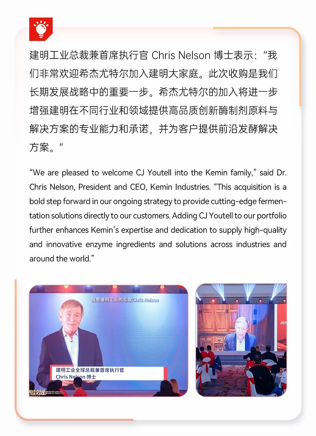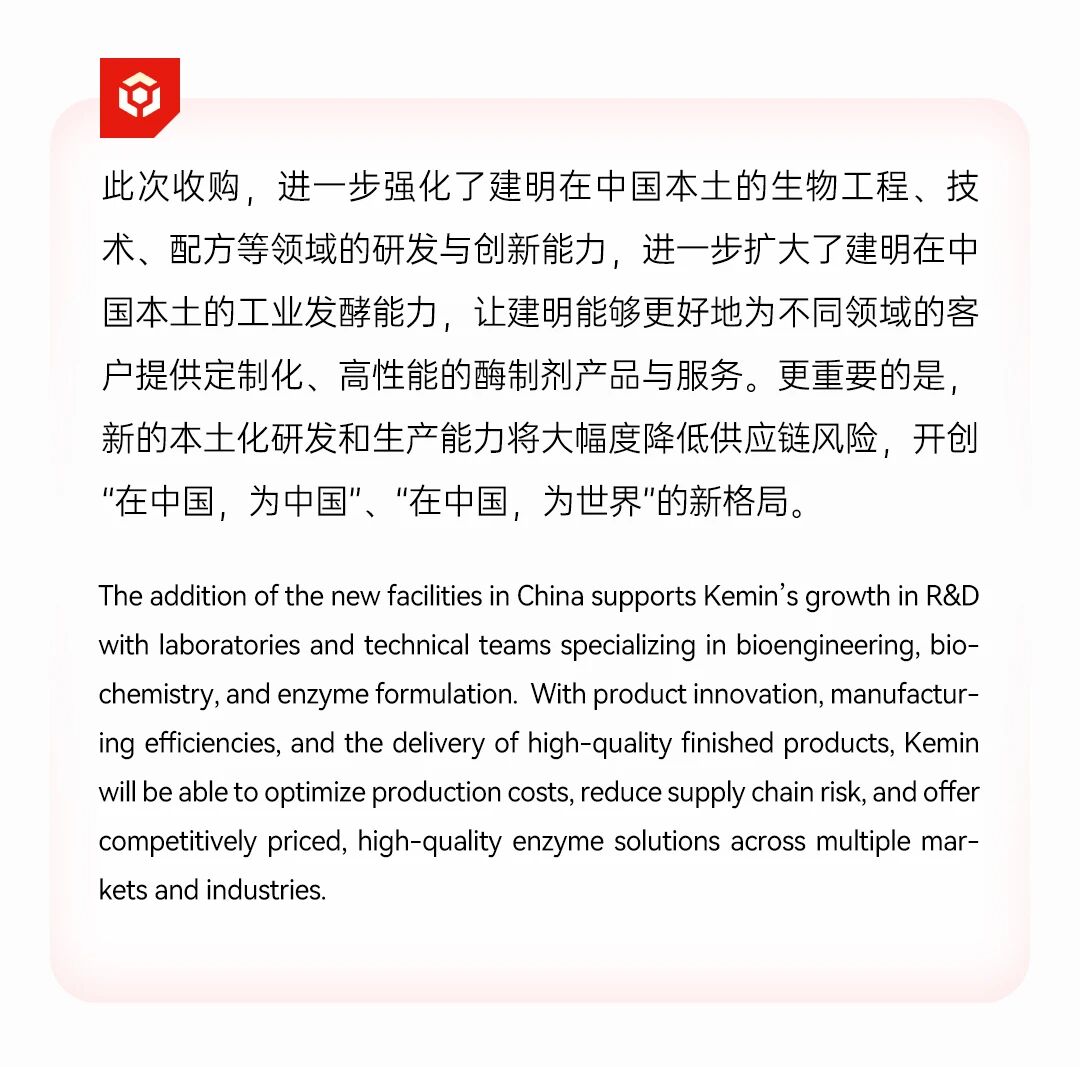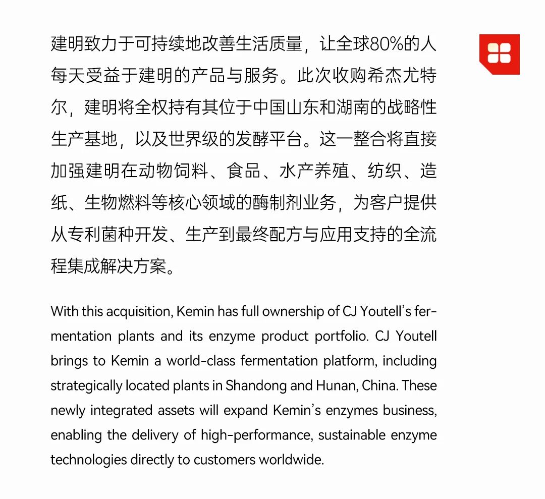 建明是一家以好奇与创想为驱动,在农作物、人类和动物健康产品及营养补充剂领域拥有创新产品的公司。自1961年于美国爱荷华州创立以来,建明已经拥有500多种产品,业务遍布全球六大洲。从穿着的牛仔面料到餐桌的各种食物,我们的产品服务于与日常生活息息相关的数十个行业。好奇与创想激励着我们以主动进取的姿态去解决全球现有的挑战。我们致力于可持续地改善生活质量,让全球80%的人每天受益于建明的产品与服务。