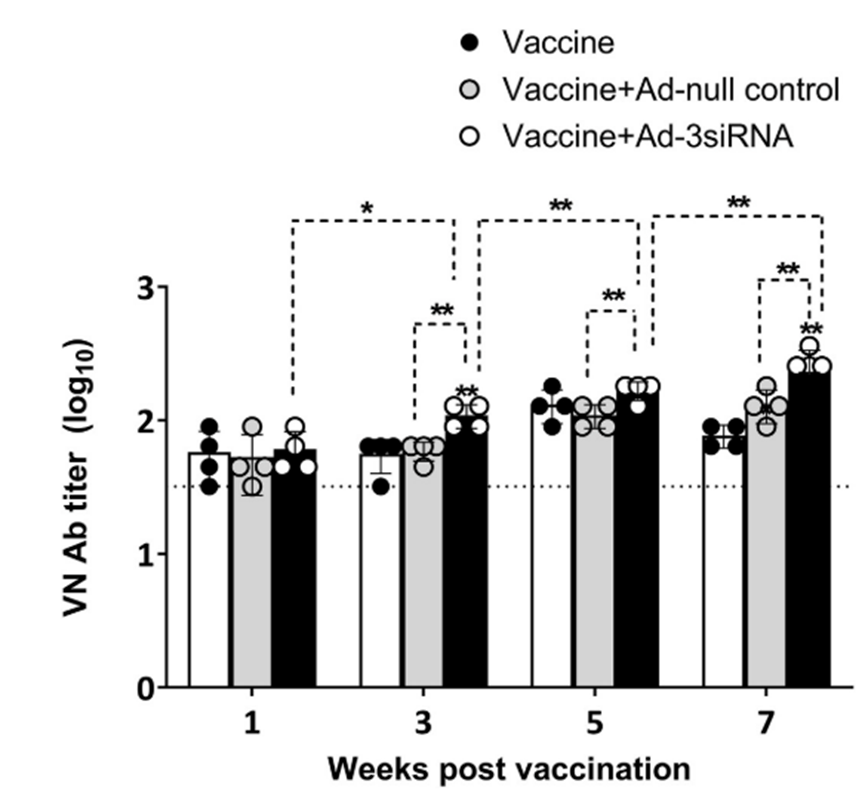 为分析接种后三周的中和抗体水平,使用C57BL/6小鼠(每组5只),通过肌内注射FMD疫苗、Ad-3siRNA或Ad-null control(3×10⁸TCID50/dose)的组合或PBS。FMD灭活疫苗使用A/SKR/Yeoncheon/2017的疫苗抗原(1μg/头份)、10%氢氧化铝凝胶和Montanide ISA 206配制而成。在接种后1、2和3周采血分离血清。