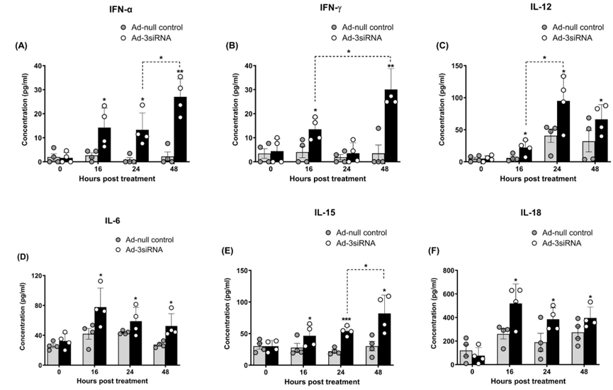 如前所述进行小鼠细胞因子测定。每组4只BALB/c小鼠通过腹腔注射0.1mL的Ad-3siRNA或Ad-null control(3×10⁸TCID50/dose)。在接种后0、16、24和48小时采血分离血清,血清用于使用小鼠IFN-α、IFN-γ、IL-12、IL-6、IL-15和IL-18 ELISA试剂盒测量IFN-α、IFN-γ、IL-12、IL-6、IL-15和IL-18的浓度。通过标准曲线插值确定蛋白质浓度。