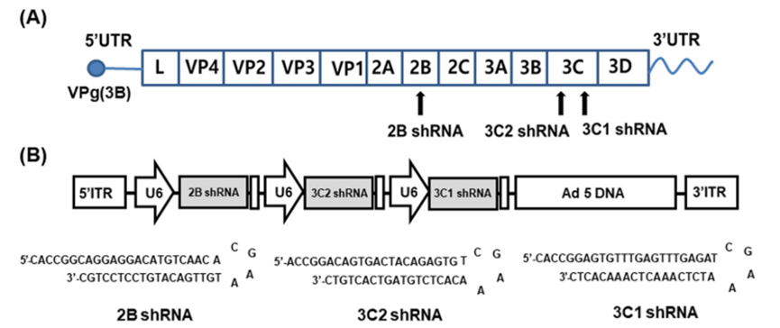 图1.Ad-3siRNA示意图。(A)口蹄疫病毒全基因组示意图。黑色箭头表示shRNA的靶区域。(B)Ad-3siRNA的构建。腺病毒DNA含有三个U6启动子、shRNA编码序列(2B、3C 2和3C 1 shRNA)和pol III转录终止子。