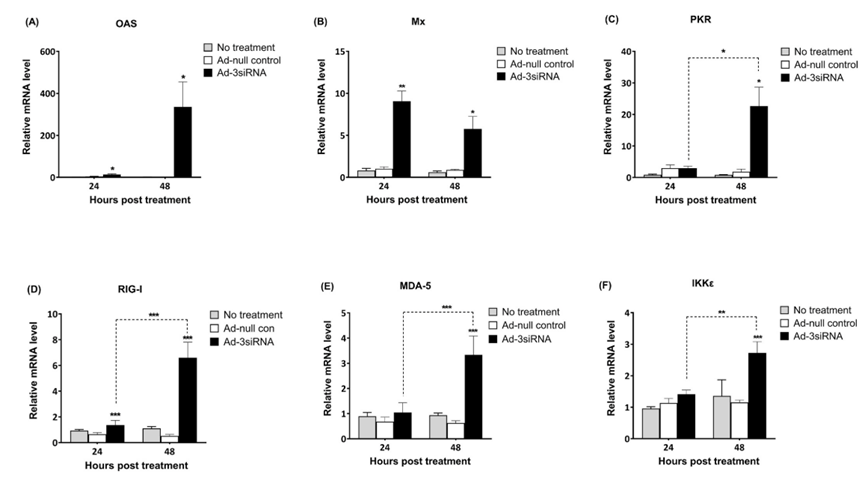 测量用Ad-3siRNA或Ad-null control处理的猪细胞中ISG(如寡腺苷酸合成酶(OAS)、粘液病毒抗性(Mx)和PKR)的mRNA水平。与Ad-null control感染或未处理的细胞相比,Ad-3siRNA感染的细胞中观察到显著升高(P<00.05,图5A-C)。在24小时观察到OAS和Mx的mRNA水平增强,在48小时检测到PKR、OAS和Mx的上调。与Ad-null control感染的细胞或未处理的细胞相比,Ad-3siRNA也上调了RIG-I和MDA-5的mRNA水平(P<00.005)(图5D和E)。另一个RLR信号相关基因IKKε在Ad-3siRNA处理后48小时上调(P<00.005)(图5F)。RIG-1、MDA-5和IKKe的mRNA表达从24到48小时逐渐升高(P<00.05)。