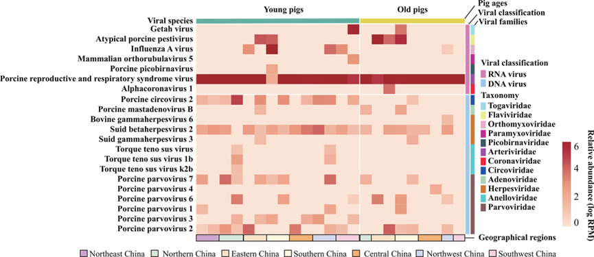 通过复转录测序和宏基因组测序从中国患有呼吸系统疾病的猪肺组织中鉴定出的病毒种类。热图显示了从中国不同地区收集的猪肺部不同病毒物种的相对丰度,相对丰度值表示为每百万分对数(RPM)。