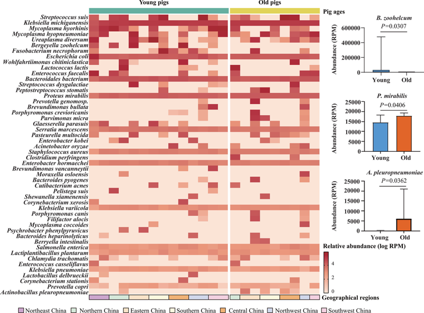 热图显示猪肺中不同细菌种类的相对丰度,相对丰度值用对数RPM表示。用柱状图显示老龄猪和幼龄猪肺中动物性贝氏杆菌、奇异变形杆菌和胸膜肺炎放线杆菌的丰度。P值是通过曼-惠特尼U试验确定的,以进行组间多次比较。数据表示平均值土标准差。