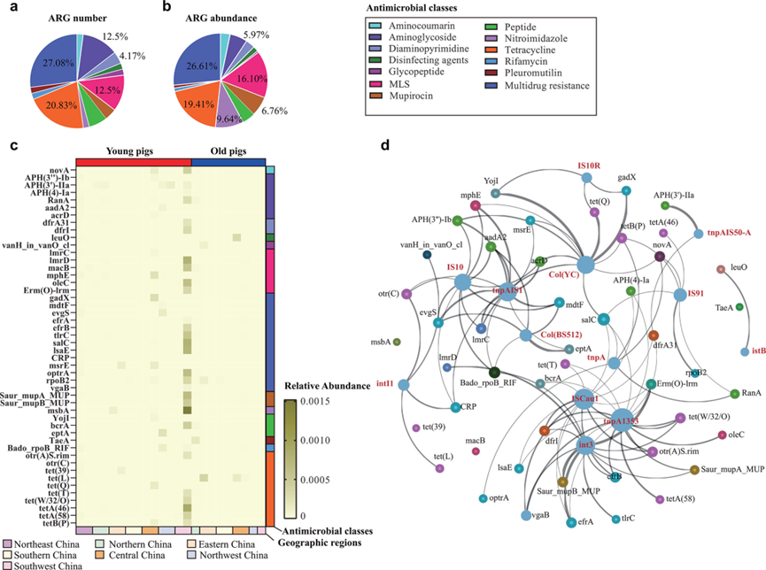 (d)中国呼吸系统疾病猪肺中ARGS和MGEs的相关性网络图。网络图的生成基于皮尔逊相关分析。每个节点的大小与连接的数量成正比,每个边缘的厚度与皮尔逊的rho值成正比。ARG的标签是黑色的,而MGE的标签是红色的。