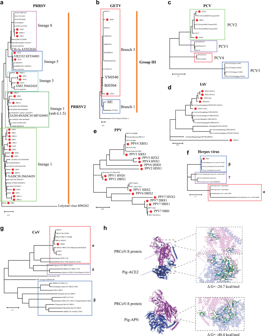 (g)冠状病毒(CoV)毒株的进化关系。本研究中识别的猪呼吸道冠状病毒(PRCoV)毒株用较小的红色圆圈表示。该树是基于刺突(S)基因的核苷酸序列生成的。(h)PRCoV毒株HDD2的刺突蛋白与猪ACE2蛋白和猪APN蛋白进行分子对接。
