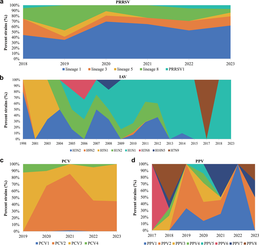 (a)根据NCBI公布的基因组序列,回顾性地确定了2018年至2023年中国猪场猪繁殖与呼吸系统综合征(PRRS)的动态变化。