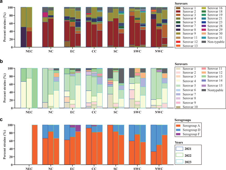 (a)2021年至2023年与猪呼吸系统疾病相关的不同血清型猪链球菌在中国不同地区的分布。