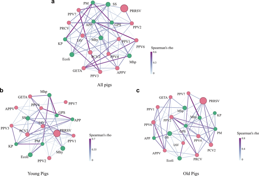 相关网生成的Spearman的相关分析的基础上。病毒被描绘成粉红色的节点,而细菌被描绘为绿色的节点。每个结点的大小对应于各自病原体的相对丰度,每个边缘的厚度和颜色强度与Spearman的rho值成正比。APP,胸膜肺炎放线杆菌;APPV,非典型猪瘟病毒;Ecoli,大肠杆菌;GETA,Getah病毒;GPS,副猪嗜血杆菌;IAV,甲型流感病毒;KP肺炎克雷伯菌;Mhp,猪肺炎支原体;Mhy,猪鼻支原体;PCV2、猪圆环病毒2;PM,多杀性巴氏杆菌;PPV1、猪细小病毒1;PPV2、猪细小病毒2;PPV3、猪细小病毒2:PPV4、猪细小病毒4;PPV6、猪细小病毒6:PPV7、猪细小病毒7:PRCV,猪呼吸道冠状病毒:PRRSV、猪生殖和呼吸综合征病毒:SS,猪链球菌。