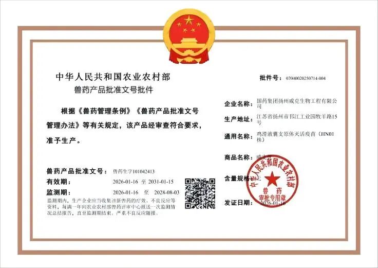 近日,国药动保子公司国药集团扬州威克生物工程有限公司(以下简称“国药动保扬州威克”)参与研制的三类新兽药“鸡滑液囊支原体灭活疫苗(HN01株)——威支优”正式获得批准文号!