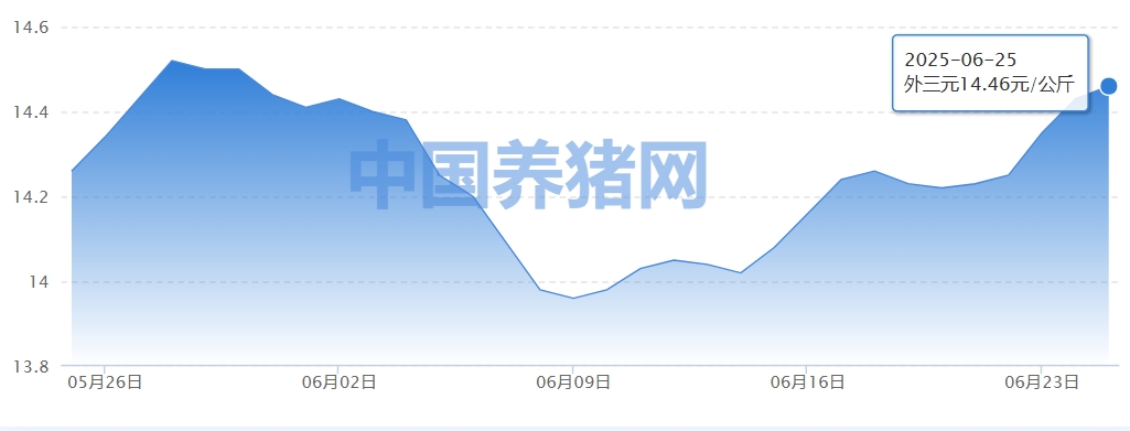 2025年6月25日,全国生猪市场延续近日回暖态势,但上涨动力渐显疲软。全国外三元生猪均价微涨至14.46元/公斤,较前一日仅上升0.03元/公斤。区域走势分化显著:华东地区表现强势,山东、江苏等地标猪出栏价上涨0.1元/斤至7.3~7.6元/斤;华中河南则下跌0.1元/斤至7.1~7.4元/斤;华南广东持稳于7.7~8.0元/斤;北方多地震荡趋弱,东北吉林维持在7.0~7.2元/斤。这种“南强北稳”格局映射出当前供需博弈的复杂性。