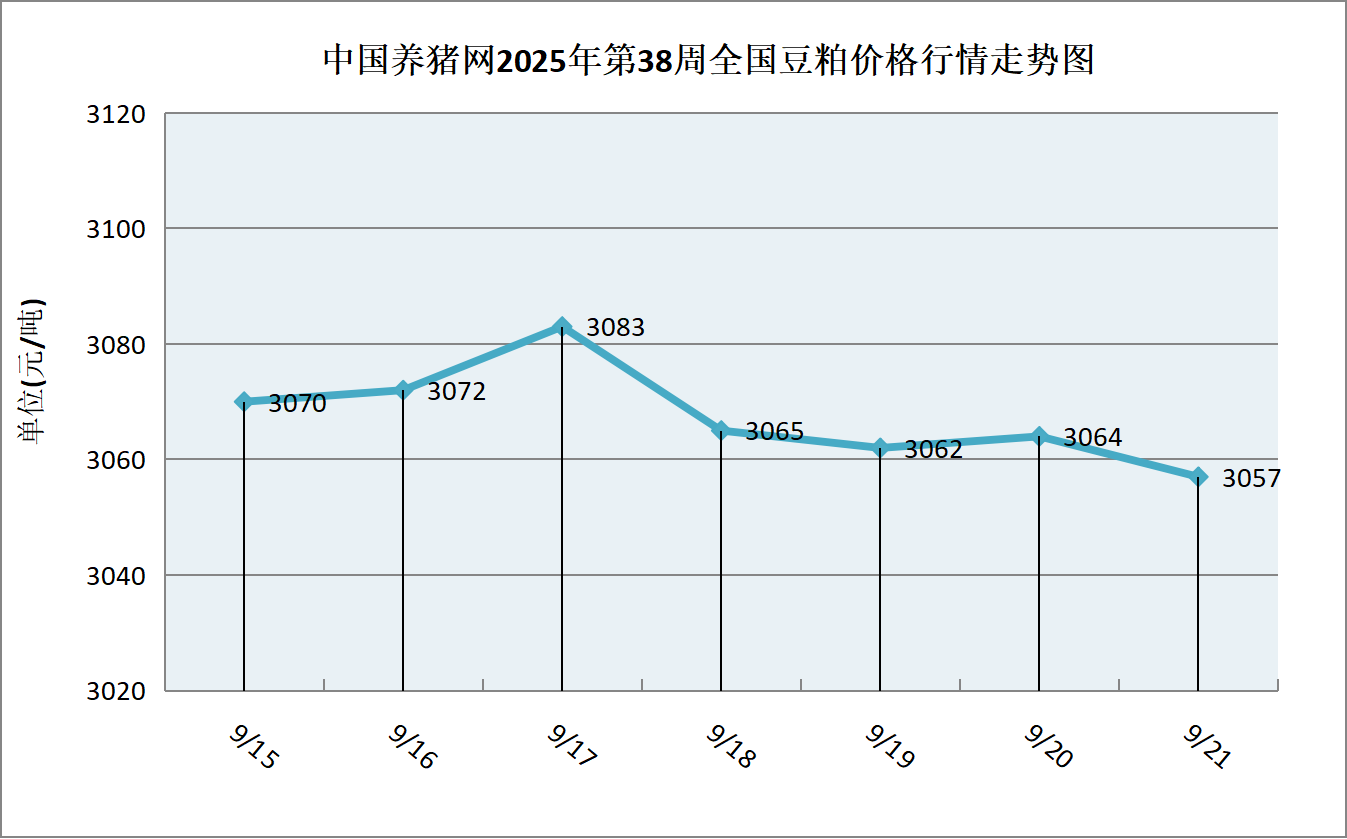 据中国养猪网猪价系统数据监测,2025年第38周(2025年09月15日至2025年09月21日)本周豆粕价格先涨后跌,整体波动不大。全周豆粕价格区间在3057-3083元/吨,周初豆粕价格为3070元/吨,周末价格为3057元/吨,全周豆粕价格累计下跌了13元/吨。