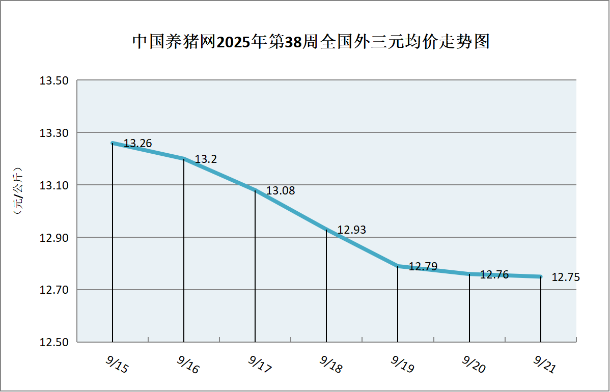 据中国养猪网猪价系统数据监测,2025年第38周(2025年09月15日至2025年09月21日)全国外三元生猪价格呈现持续走跌势态,整体区间在12.75-13.26元/公斤之间!周初猪价为13.26元/公斤,周末猪价为12.75元/公斤,全周猪价累计下跌了0.51元/公斤。