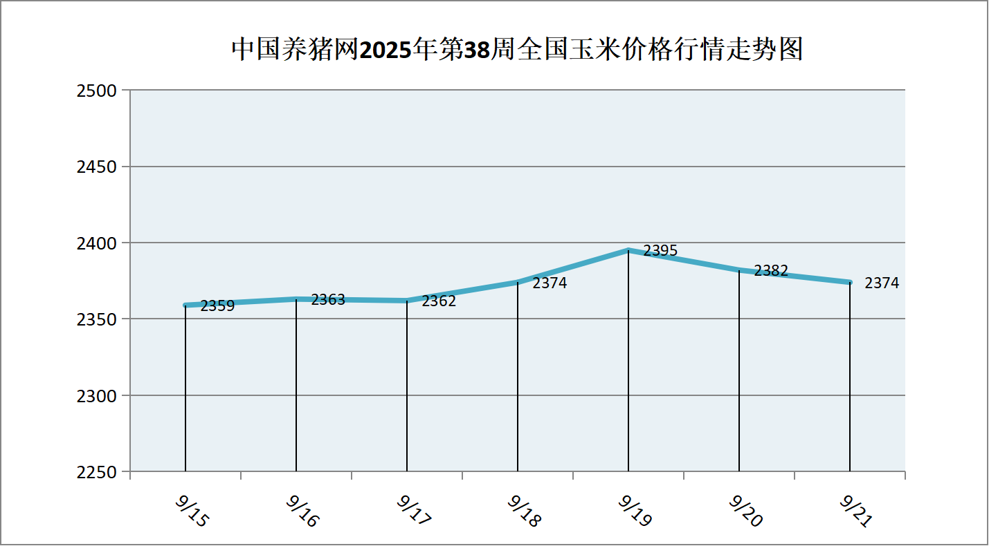 据中国养猪网猪价系统数据监测,2025年第38周(2025年09月15日至2025年09月21日)本周玉米价格先涨后跌,全周玉米价格区间在2359-2395元/吨之间,周初玉米价格为2359元/吨,周末价格为2374元/吨,全周玉米价格累计上涨了15元/吨。
