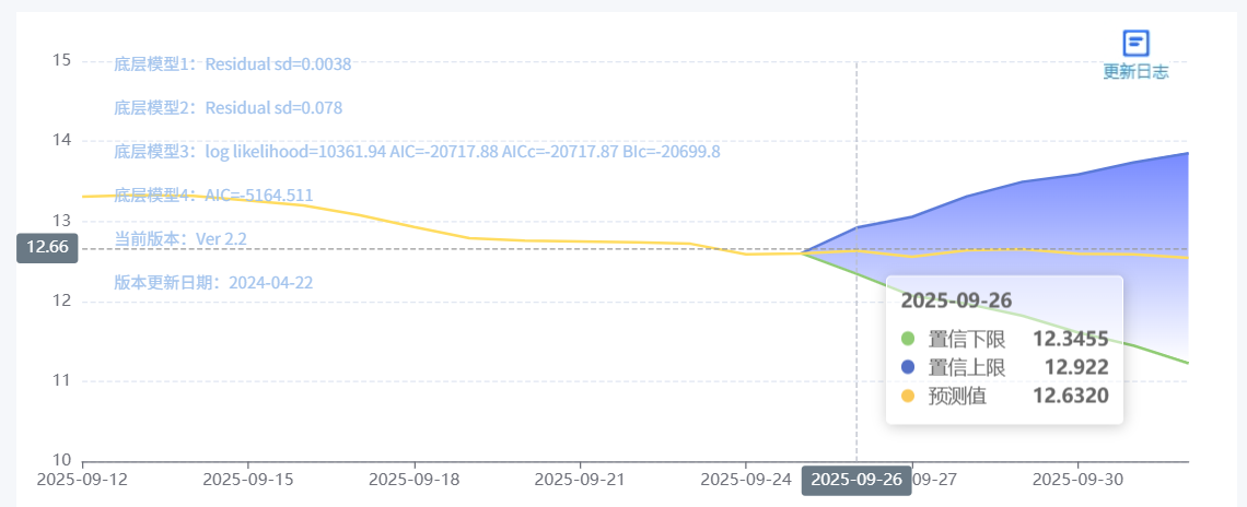 玄田算法是由项目课题组团队原创的非经典逻辑数值聚合理论和不确定性预测方法,构建了基于一致模算子的生猪价格预测模型。该模型采用的聚合函数及一致模相关理论与方法已获得多项国家自然科学基金和省级自然科学资金资助,并获得多项省级自然科学奖奖项。09月26日预测猪价为12.5470,置信区间在12.0580--13.037之间。09月27日预测猪价为12.5100;09月28日预测猪价为12.5332。