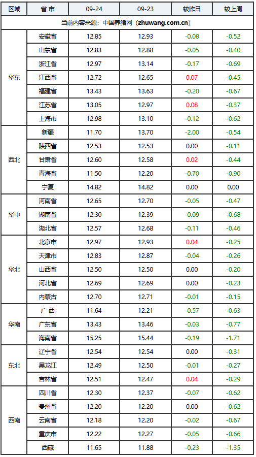 据中国养猪网统计,09月25日,全国外三元生猪价格均价为12.60元/公斤,较昨日报价上涨了0.01元/公斤。全国猪价最高为海南省15.23元/公斤,最低为广西壮族自治区11.58元/公斤。整体看来,今日外三元生猪价格走势为14涨3平14跌。