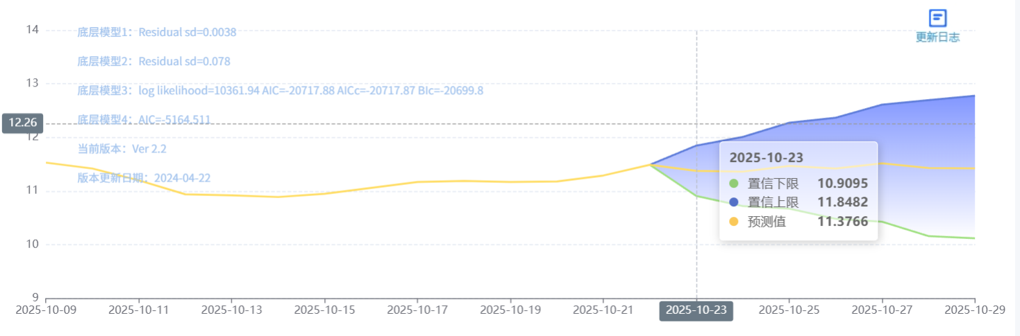 玄田算法是由项目课题组团队原创的非经典逻辑数值聚合理论和不确定性预测方法,构建了基于一致模算子的生猪价格预测模型。该模型采用的聚合函数及一致模相关理论与方法已获得多项国家自然科学基金和省级自然科学资金资助,并获得多项省级自然科学奖奖项。10月23日预测猪价为11.3766,置信区间在10.9095--11.8482之间。10月24日预测猪价为11.3619;10月25日预测猪价为11.4687。
