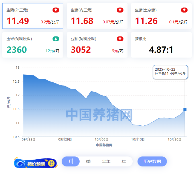 据中国养猪网统计,10月22日,全国外三元生猪价格均价为11.49元/公斤,较昨日报价上涨了0.20元/公斤。全国猪价最高为宁夏回族自治区14.94元/公斤,最低为西藏自治区9.26元/公斤。整体看来,今日外三元生猪价格走势为29涨1平1跌。