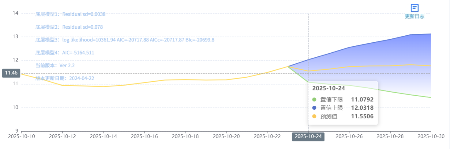 玄田算法是由项目课题组团队原创的非经典逻辑数值聚合理论和不确定性预测方法,构建了基于一致模算子的生猪价格预测模型。该模型采用的聚合函数及一致模相关理论与方法已获得多项国家自然科学基金和省级自然科学资金资助,并获得多项省级自然科学奖奖项。10月24日预测猪价为11.5506,置信区间在11.0792--12.0318之间。10月25日预测猪价为11.6314;10月26日预测猪价为11.7375。
