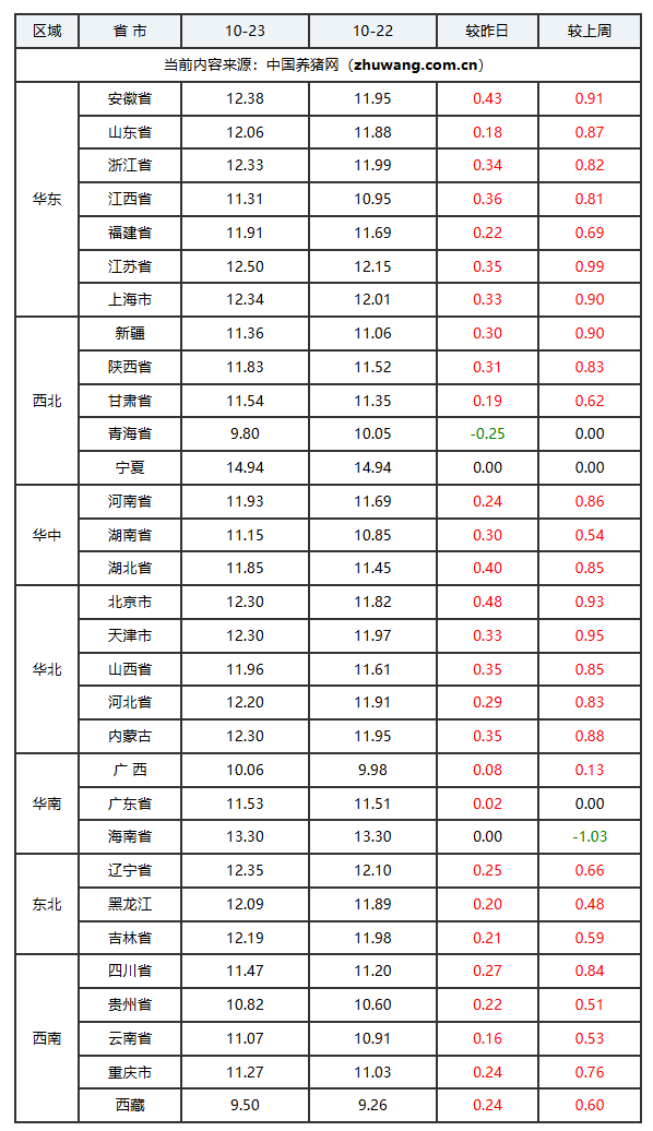 据中国养猪网统计,10月23日,全国外三元生猪价格均价为11.74元/公斤,较昨日报价上涨了0.25元/公斤。全国猪价最高为宁夏回族自治区14.94元/公斤,最低为西藏自治区9.50元/公斤。整体看来,今日外三元生猪价格走势为28涨2平1跌。