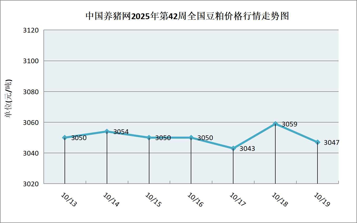 据中国养猪网猪价系统数据监测,2025年第42周(2025年10月13日至2025年10月19日)本周豆粕价格周初价格涨跌交替,整体处于小幅波动。全周豆粕价格区间在3043-3059元/吨,周初豆粕价格为3050元/吨,周末价格为3047元/吨,全周豆粕价格累计下跌了3元/吨。