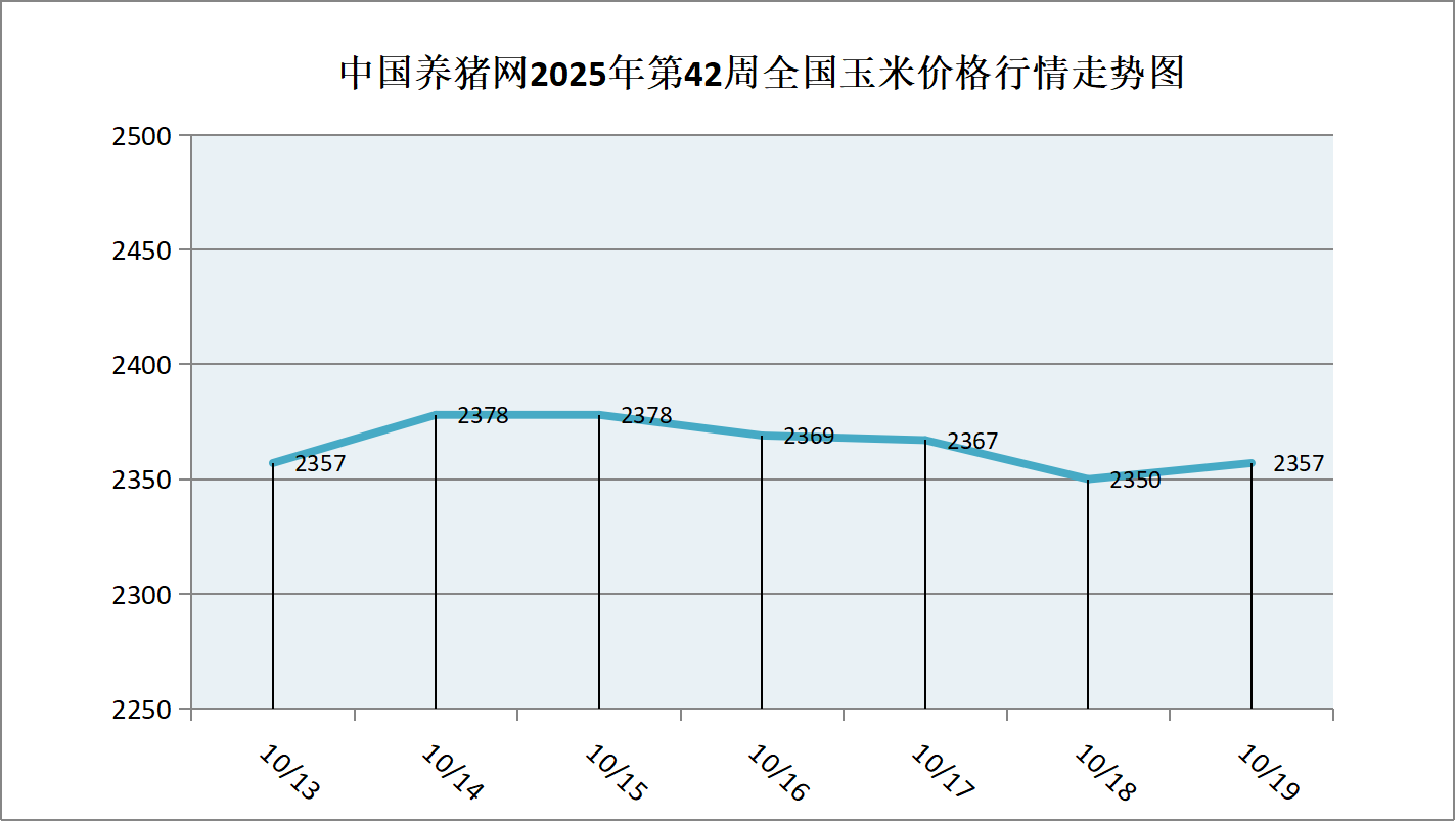 据中国养猪网猪价系统数据监测,2025年第42周(2025年10月13日至2025年10月19日)本周玉米价格市场整体以涨跌互现为主,全周玉米价格区间在2350-2378元/吨之间,周初玉米价格为2357元/吨,周末价格为2357元/吨,全周玉米价格累计下跌了0元/吨。