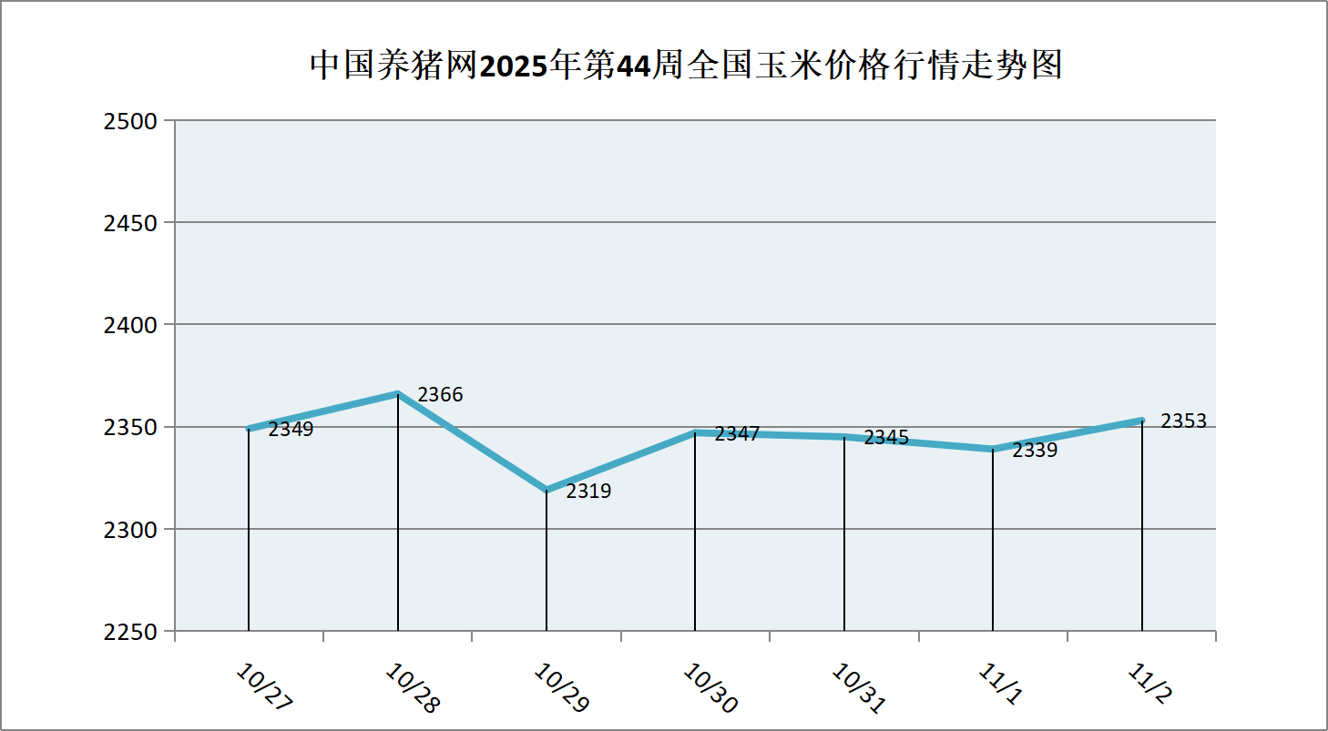 据中国养猪网猪价系统数据监测,2025年第44周(2025年10月27日至2025年11月02日)本周玉米价格市场整体以涨跌互现为主,全周玉米价格区间在2319-2366元/吨之间,周初玉米价格为2349元/吨,周末价格为2353元/吨,全周玉米价格累计上涨了4元/吨。