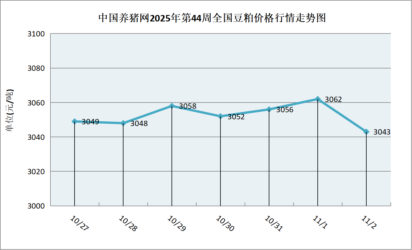 据中国养猪网猪价系统数据监测,2025年第44周(2025年10月27日至2025年11月02日)本周豆粕价格周内整体处于小幅波动。全周豆粕价格区间在3043-3062元/吨,周初豆粕价格为3049元/吨,周末价格为3043元/吨,全周豆粕价格累计下跌了6元/吨。