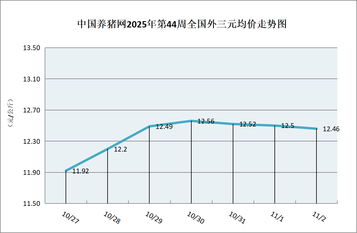 据中国养猪网猪价系统数据监测,2025年第44周(2025年10月27日至2025年11月02日)全国外三元生猪价格呈现回温走势,整体区间在11.92-12.56元/公斤之间!周初猪价为11.92元/公斤,周末猪价为12.46元/公斤,全周猪价累计上涨了0.54元/公斤。