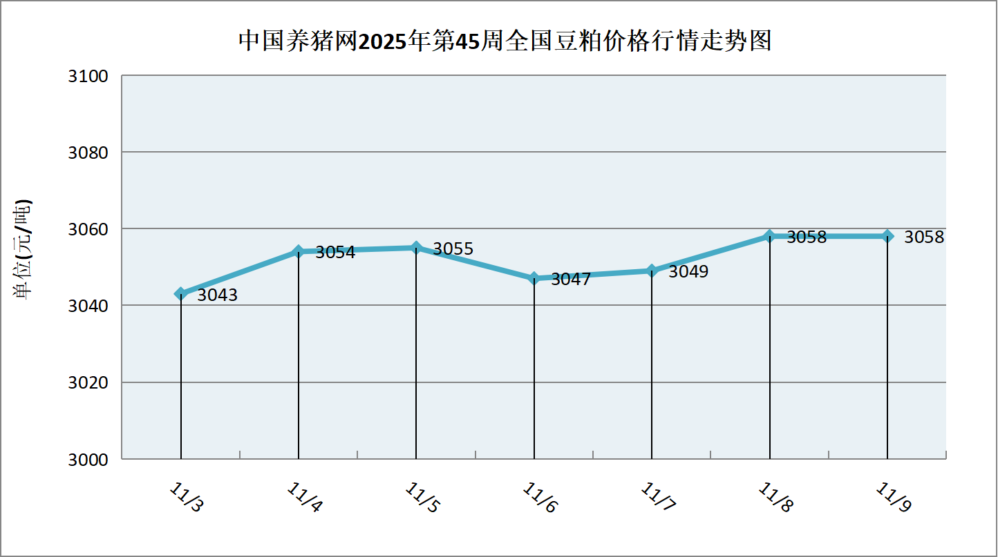 据中国养猪网猪价系统数据监测,2025年第45周(2025年11月03日至2025年11月09日)本周豆粕价格周内呈现震荡盘整态势。全周豆粕价格区间在3043-3058元/吨,周初豆粕价格为3043元/吨,周末价格为3058元/吨,全周豆粕价格累计上涨了15元/吨。