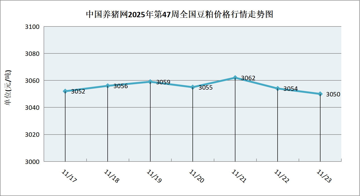 据中国养猪网猪价系统数据监测,2025年第47周(2025年11月10日至2025年11月23日)本周豆粕价格周内呈现窄幅波动态势。全周豆粕价格区间在3050-3062元/吨,周初豆粕价格为3052元/吨,周末价格为3050元/吨,全周豆粕价格累计下跌了2元/吨。
