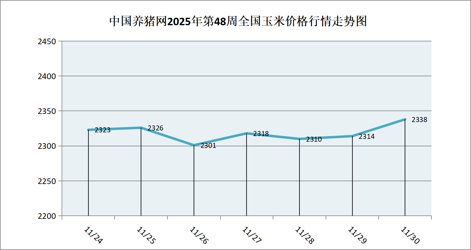 据中国养猪网猪价系统数据监测,2025年第48周(2025年11月24日至2025年11月30日)本周玉米价格市场以涨跌互现为主,震荡较为频繁,全周玉米价格区间在2301-2338元/吨之间,周初玉米价格为2323元/吨,周末价格为2338元/吨,全周玉米价格累计上涨了15元/吨。