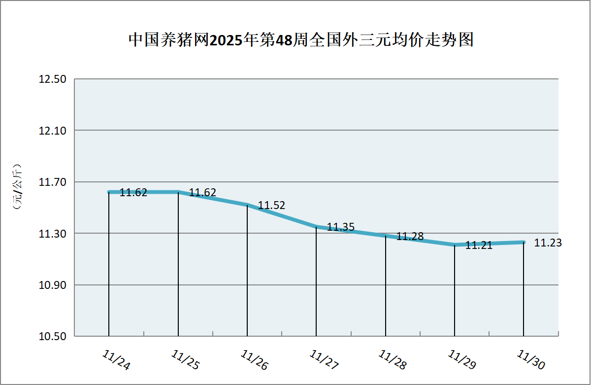 据中国养猪网猪价系统数据监测,2025年第49周(2025年11月24日至2025年11月30日)全国外三元生猪价格呈现持续小幅走跌势态,整体区间在11.21-11.62元/公斤之间!周初猪价为11.62元/公斤,周末猪价为11.23元/公斤,全周猪价累计下跌了0.39元/公斤。