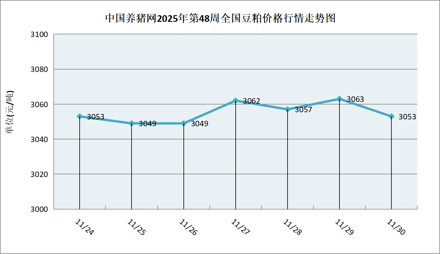 据中国养猪网猪价系统数据监测,2025年第48周(2025年11月24日至2025年11月30日)本周豆粕价格周内呈现窄幅波动态势。全周豆粕价格区间在3049-3063元/吨,周初豆粕价格为3053元/吨,周末价格为3053元/吨,全周豆粕价格累计下跌了0元/吨。