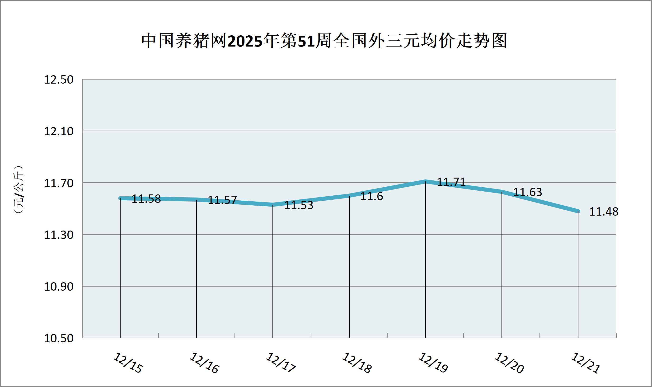据中国养猪网猪价系统数据监测,2025年第51周(2025年12月15日至2025年12月21日)全国外三元生猪价格呈现持续震荡波动行情,整体区间在11.48-11.71元/公斤之间!周初猪价为11.58元/公斤,周末猪价为11.48元/公斤,全周猪价累计下跌了0.10元/公斤。