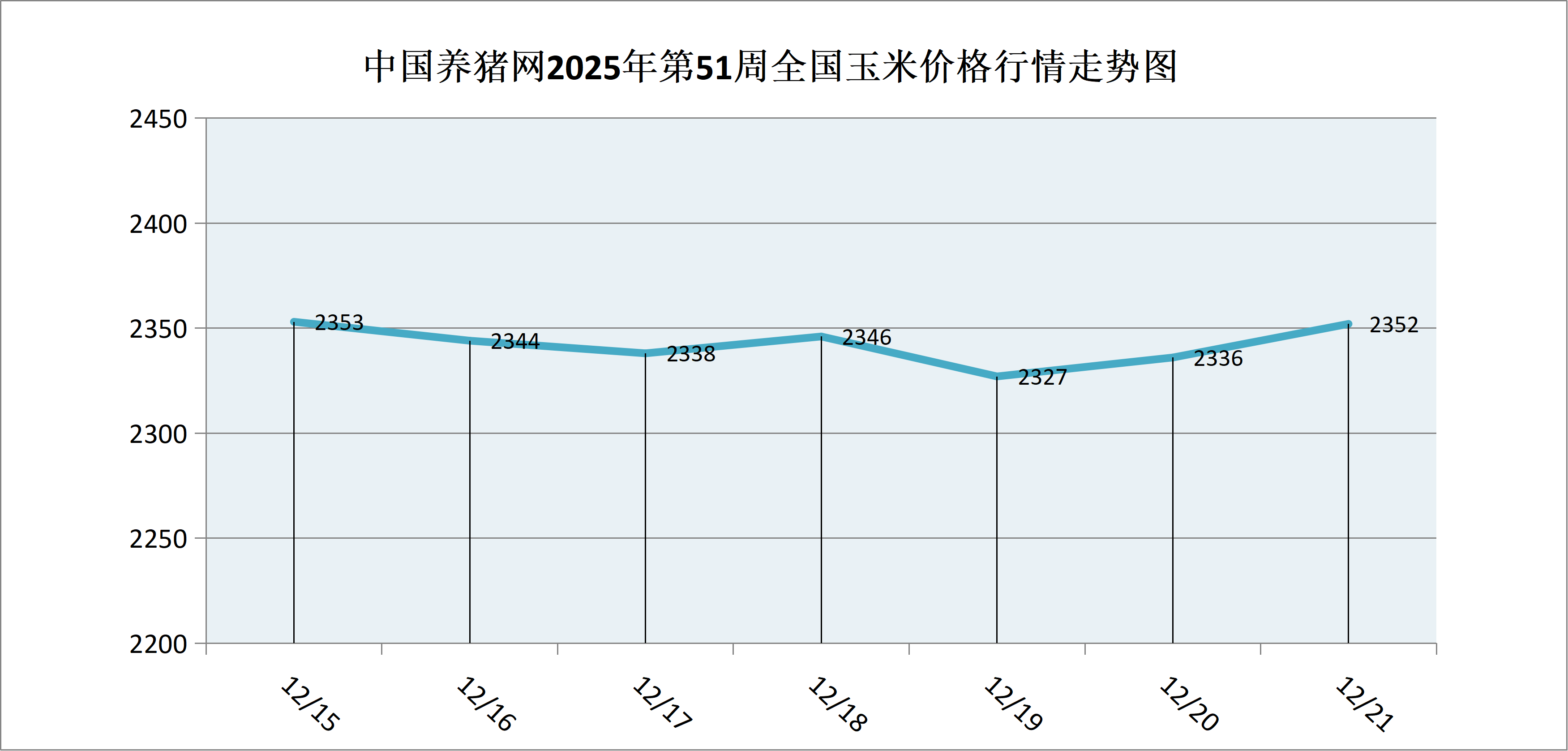 据中国养猪网猪价系统数据监测,2025年第51周(2025年12月15日至2025年12月21日)本周玉米价格市场体表现稳定,全周玉米价格区间在2327-2353元/吨之间,周初玉米价格为2353元/吨,周末价格为2352元/吨,全周玉米价格累计下跌了1元/吨。