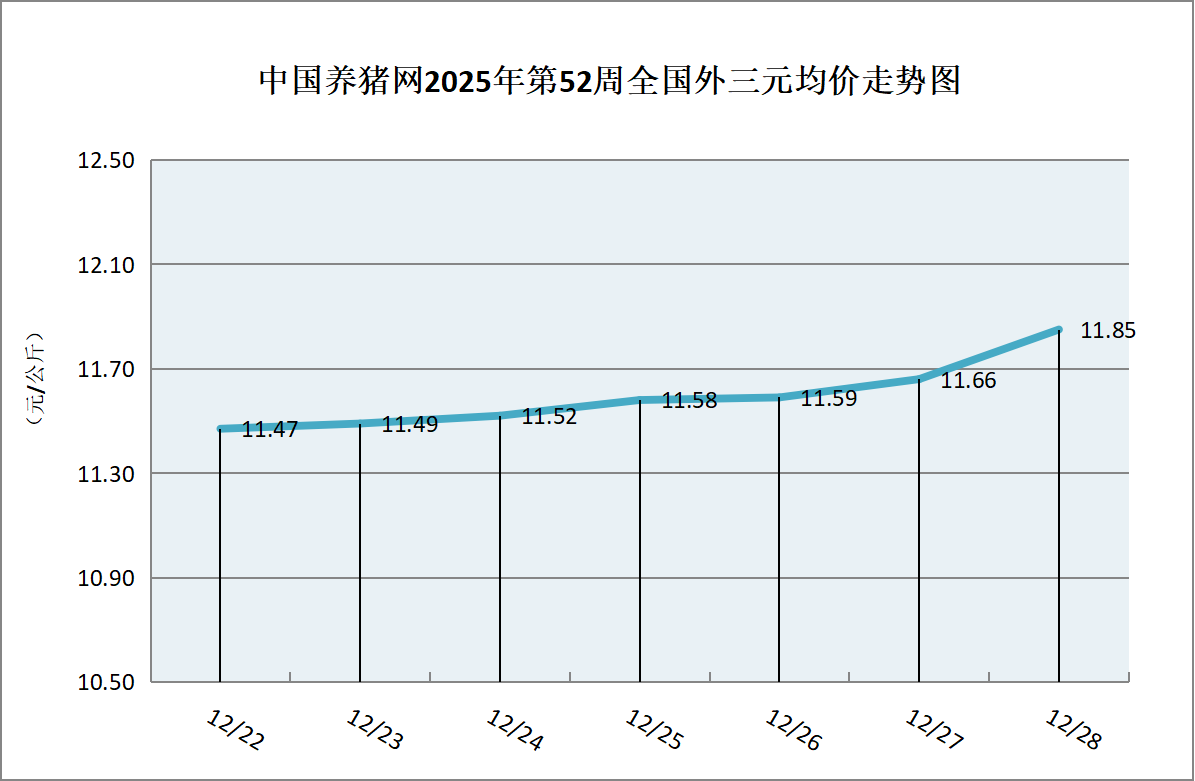 据中国养猪网猪价系统数据监测,2025年第52周(2025年12月22日至2025年12月28日)全国外三元生猪价格呈现持续震荡上扬行情,整体区间在11.47-11.85元/公斤之间!周初猪价为11.58元/公斤,周末猪价为11.85元/公斤,全周猪价累计上涨了0.38元/公斤。