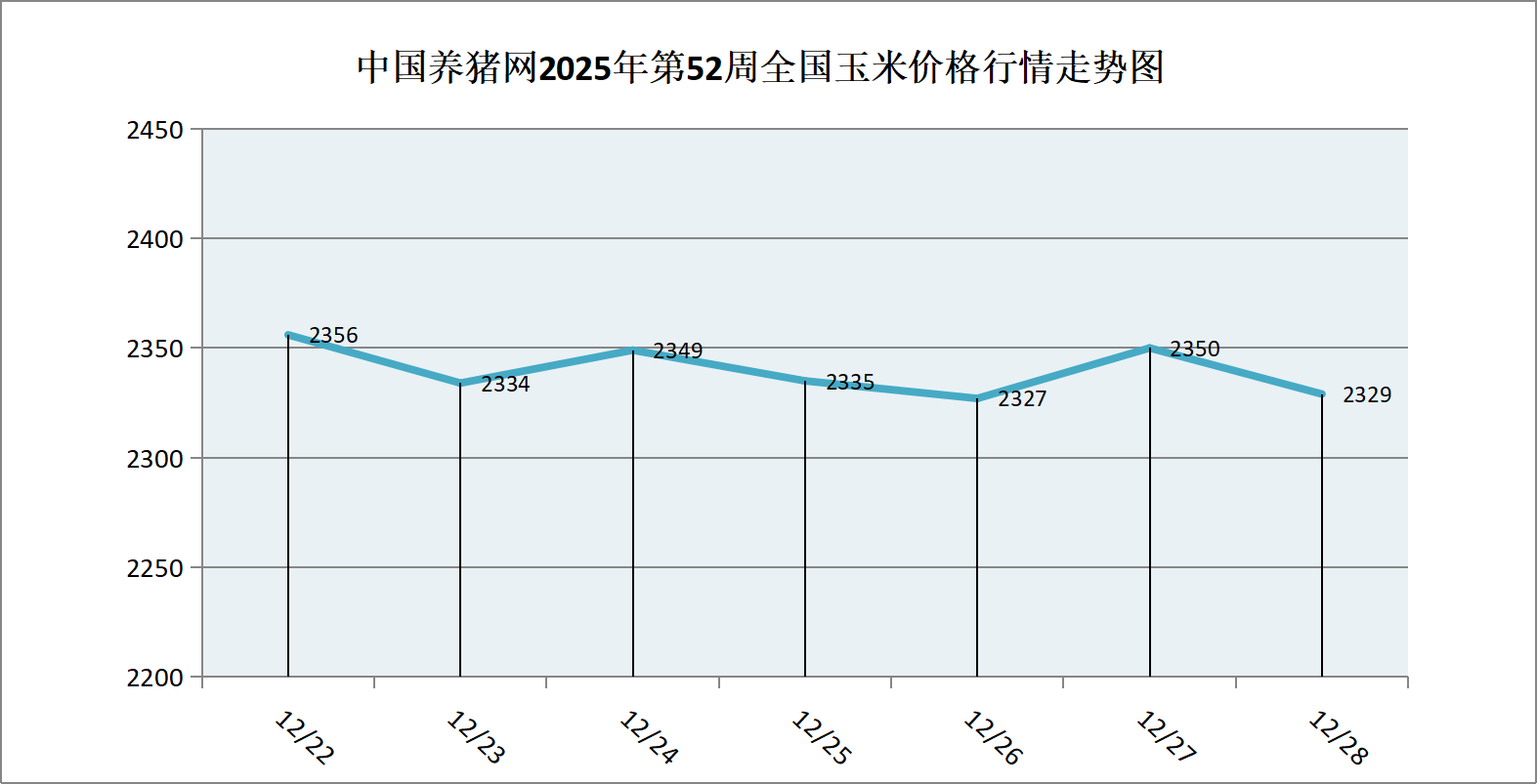 据中国养猪网猪价系统数据监测,2025年第52周(2025年12月22日至2025年12月28日)本周玉米价格市场以涨跌调整为主,全周玉米价格区间在2327-2356元/吨之间,周初玉米价格为2356元/吨,周末价格为2329元/吨,全周玉米价格累计下跌了27元/吨。