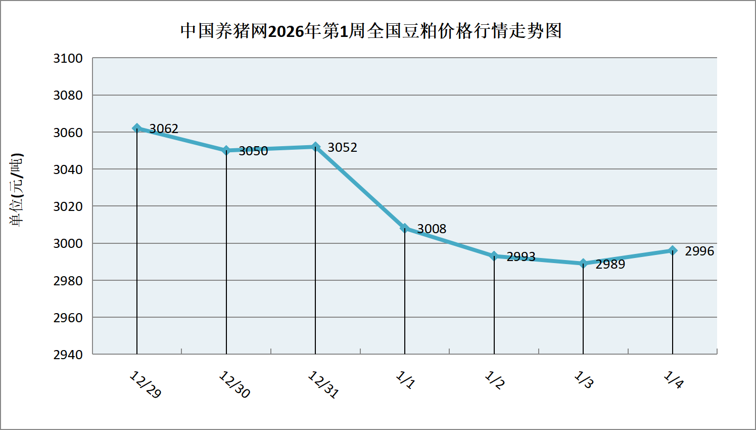 据中国养猪网猪价系统数据监测,2026年第1周(2025年12月29日至2026年01月04日)本周豆粕价格整体呈走跌态势。全周豆粕价格区间在2989-3062元/吨,周初豆粕价格为3062元/吨,周末价格为2996元/吨,全周豆粕价格累计下跌了66元/吨。