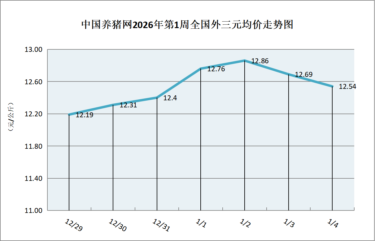 据中国养猪网猪价系统数据监测,2026年第1周(2025年12月29日至2026年01月04日)全国外三元生猪价格呈现持续震荡上行行情,从周初的11.58元/公斤逐步攀升至周末的11.85元/公斤,随后略有回落,但整体仍保持上涨态势。整体区间在12.19-12.86元/公斤之间!周初猪价为12.19元/公斤,周末猪价为12.54元/公斤,全周猪价累计上涨了0.35元/公斤。