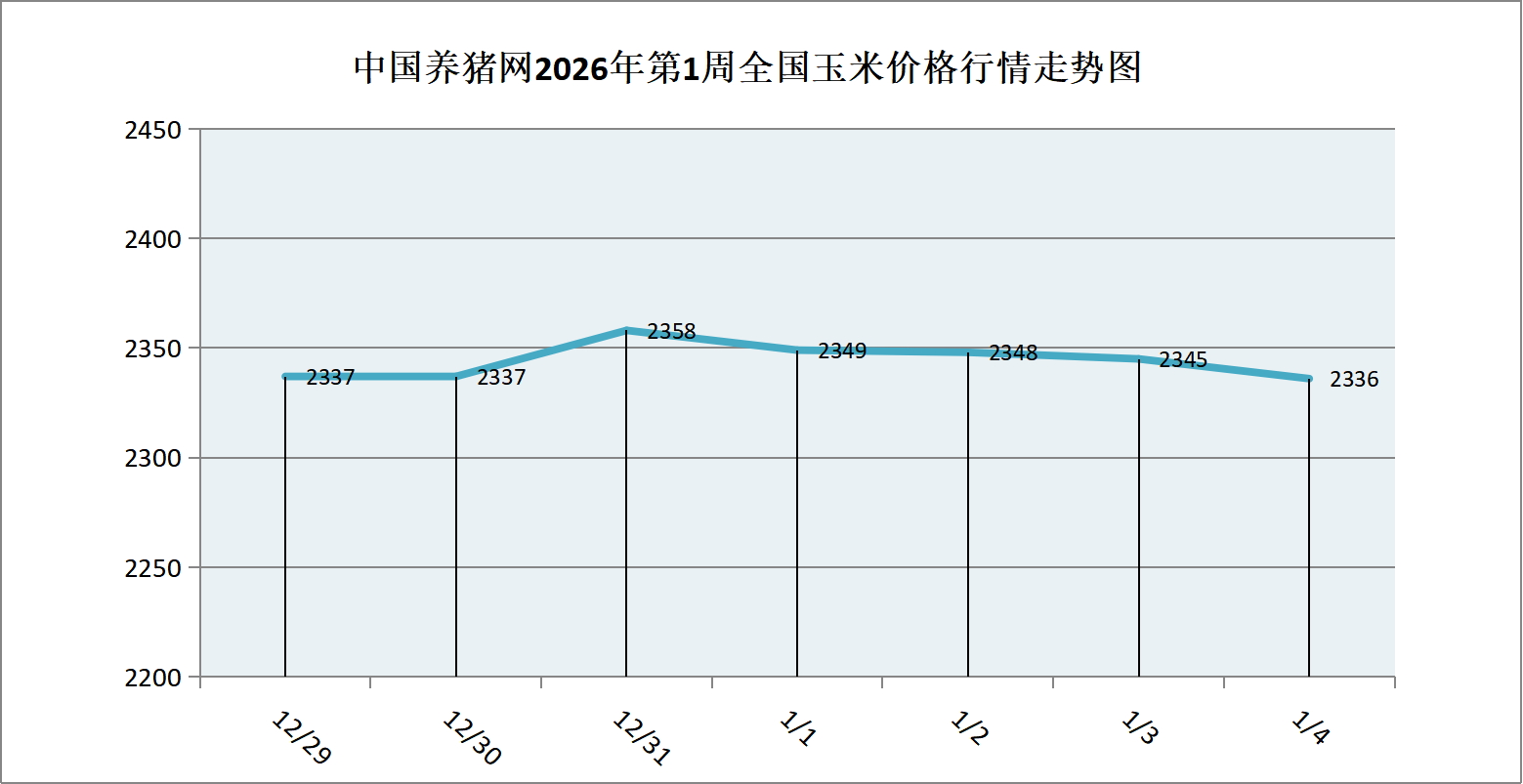 据中国养猪网猪价系统数据监测,2026年第1周(2025年12月29日至2026年01月04日)本周玉米价格市场从趋势上看,玉米价格在周初小幅下跌,周中有所反弹,但整体仍保持下跌态势,最终收于周低位附近。全周玉米价格区间在2336-2358元/吨之间,周初玉米价格为2337元/吨,周末价格为2336元/吨,全周玉米价格累计下跌了1元/吨。