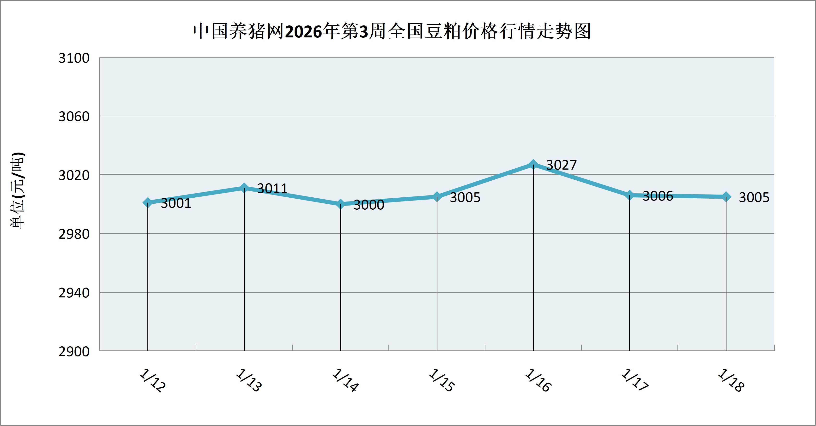 据中国养猪网猪价系统数据监测,2026年第3周(2026年1月12日至2026年01月18日)本周豆粕价格整体呈现先扬后抑的震荡走势。周初延续上周态势小幅上扬,随后波动回落,周末价格逐步趋稳。全周豆粕价格区间在3000-3027元/吨,周初豆粕价格为3001元/吨,周末价格为3005元/吨,全周豆粕价格累计上涨了4元/吨。