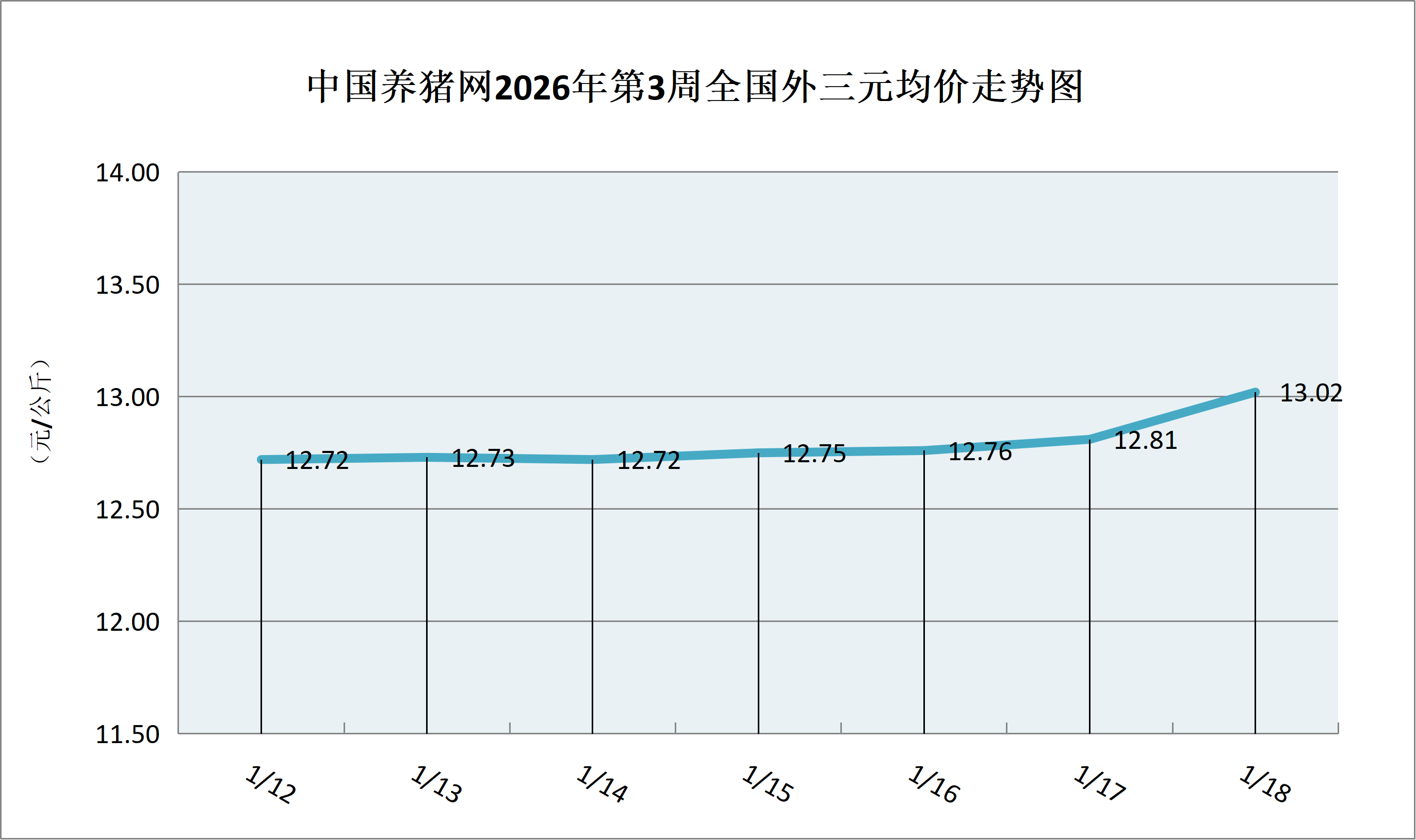 据中国养猪网猪价系统数据监测,2026年第3周(2026年1月12日至2026年01月18日)全国外三元生猪价格呈现震荡上涨趋势。整体区间在12.72-13.02元/公斤之间!周初猪价为12.72元/公斤,周末猪价为13.02元/公斤,全周猪价累计上涨了0.30元/公斤。