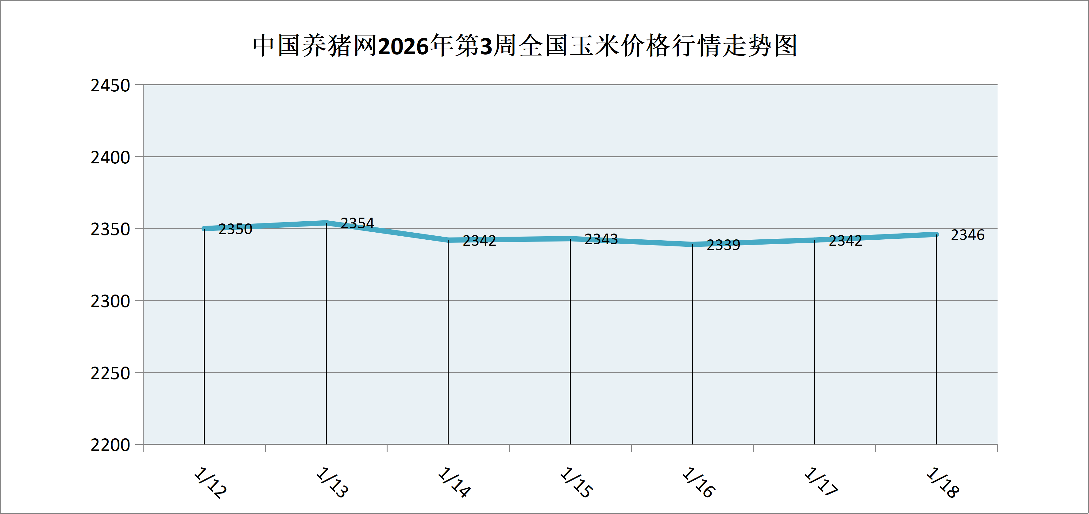 据中国养猪网猪价系统数据监测,2026年第3周(2026年1月12日至2026年01月18日)本周玉米价格整体呈小幅震荡走势,周初价格小幅下行,随后逐步回升并趋于平稳。全周玉米价格区间在2342-2354元/吨之间,周初玉米价格为2350元/吨,周末价格为2346元/吨,全周玉米价格累计下跌了4元/吨。