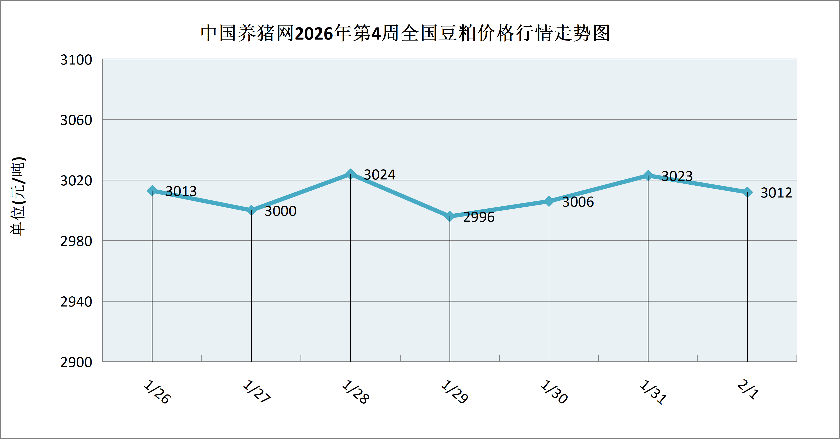 据中国养猪网猪价系统数据监测,2026年第5周(2026年1月26日至2026年02月01日)本周豆粕价格整体呈现窄幅震荡趋势。全周豆粕价格区间在2996-3024元/吨,周初豆粕价格为3013元/吨,周末价格为3012元/吨,全周豆粕价格累计下跌了1元/吨。