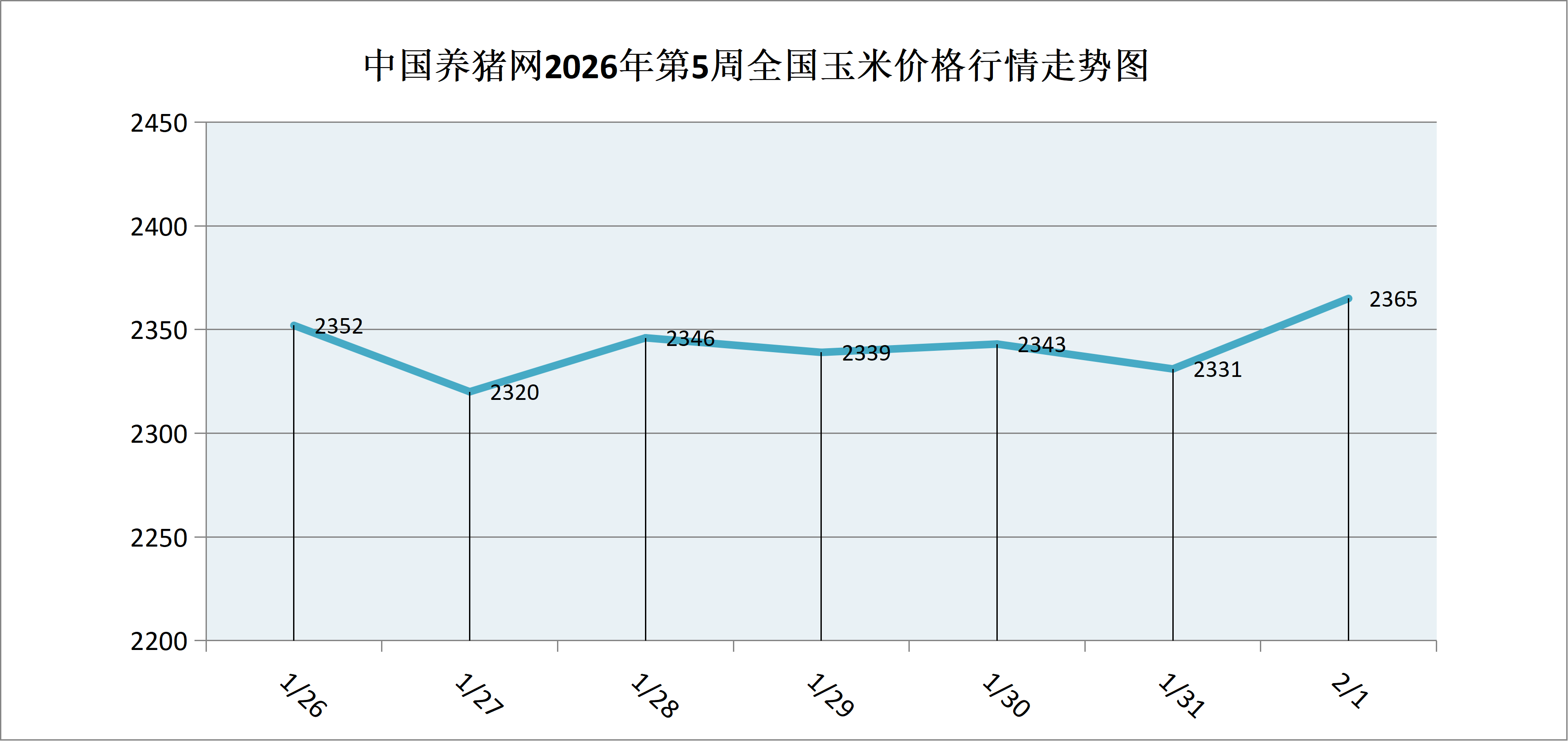 据中国养猪网猪价系统数据监测,2026年第5周(2026年1月26日至2026年02月01日)本周玉米价格整体呈震荡调整势态。全周玉米价格区间在2320-2365元/吨之间,周初玉米价格为2352元/吨,周末价格为2365元/吨,全周玉米价格累计上涨了13元/吨。