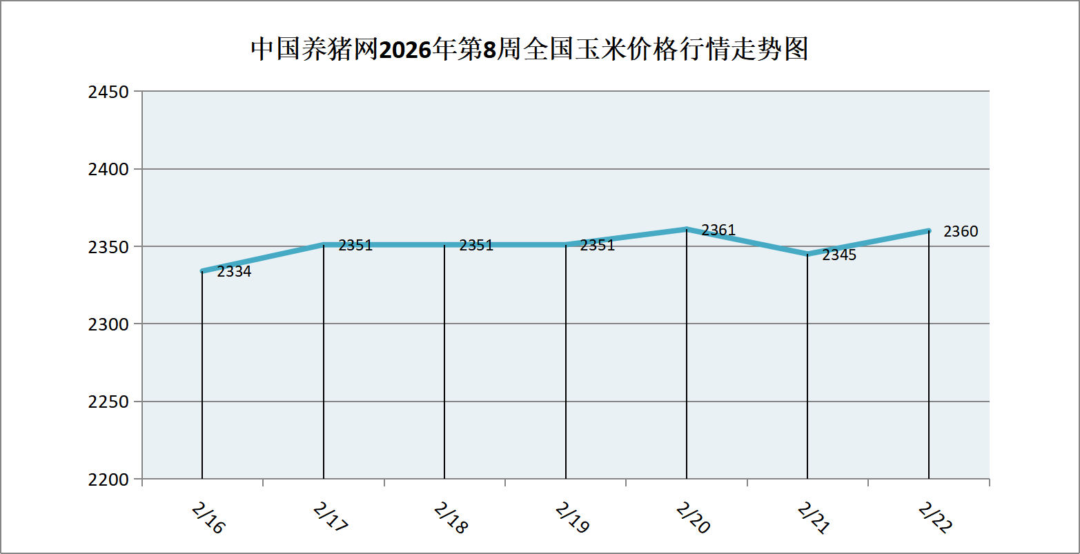据中国养猪网猪价系统数据监测,2026年第8周(2026年02月16日至2026年02月22日)本周玉米价格整体呈小幅上涨走势,整体波动不大。全周玉米价格区间在2334-2361元/吨之间,周初玉米价格为2334元/吨,周末价格为2360元/吨,全周玉米价格累计上涨了26元/吨。